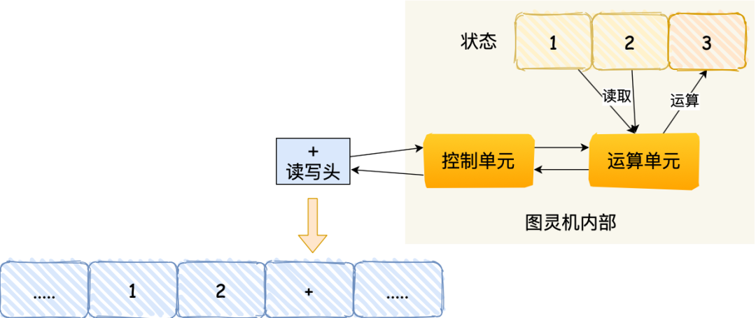 知道了圖靈機(jī)的組成后,我們以簡單數(shù)學(xué)運(yùn)算的1 + 2 作為例子,來看看它是怎么執(zhí)行這行代碼的。