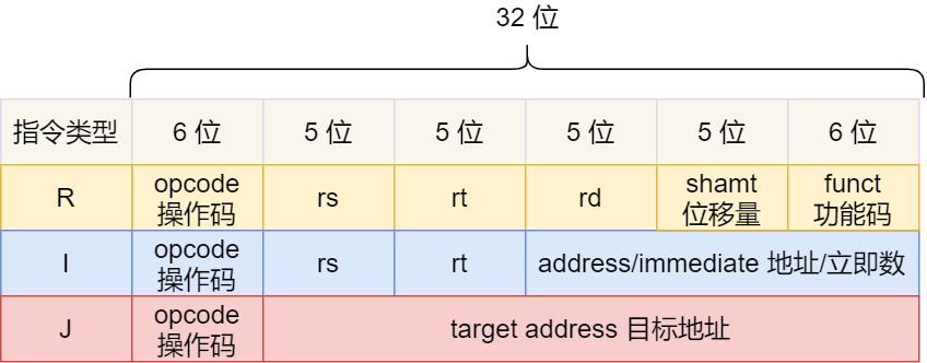 MIPS 的指令是一個(gè) 32 位的整數(shù),高 6 位代表著操作碼,表示這條指令是一條什么樣的指令,剩下的 26 位不同指令類型所表示的內(nèi)容也就不相同,主要有三種類型R、I 和 J。