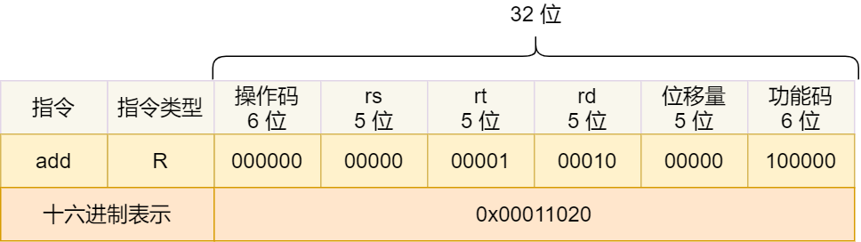 把上面這些數(shù)字拼在一起就是一條 32 位的 MIPS 加法指令了,那么用 16 進(jìn)制表示的機(jī)器碼則是 0x00011020。